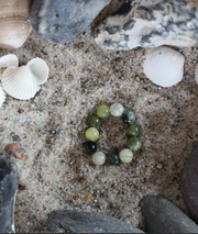 Handgemachter Fingerring aus hellgrünen Perlensteinen mit unterschiedlichen Farbakzenten. Naturprodukt, daher kann die Farbe immer leicht variieren.